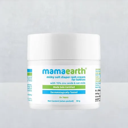 Rs.Mamaearth Milky Soft Diaper Rash Cream, gentle on baby's skin. Prevents rashes, irritation from wet diapers. Oat Milk, Calendula, Soybean Oil, 15 Percent Zinc Oxide nourish and protect. MadeSafe Certified, keeps out wetness. No Silicones, Parabens, Mineral Oil, Dyes. Rapid relief, future rash prevention. Care for your baby's delicate skin!